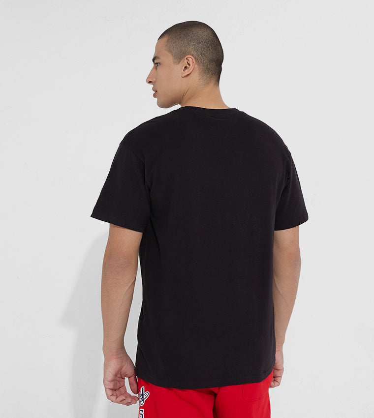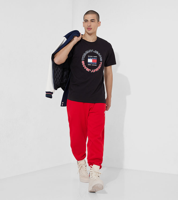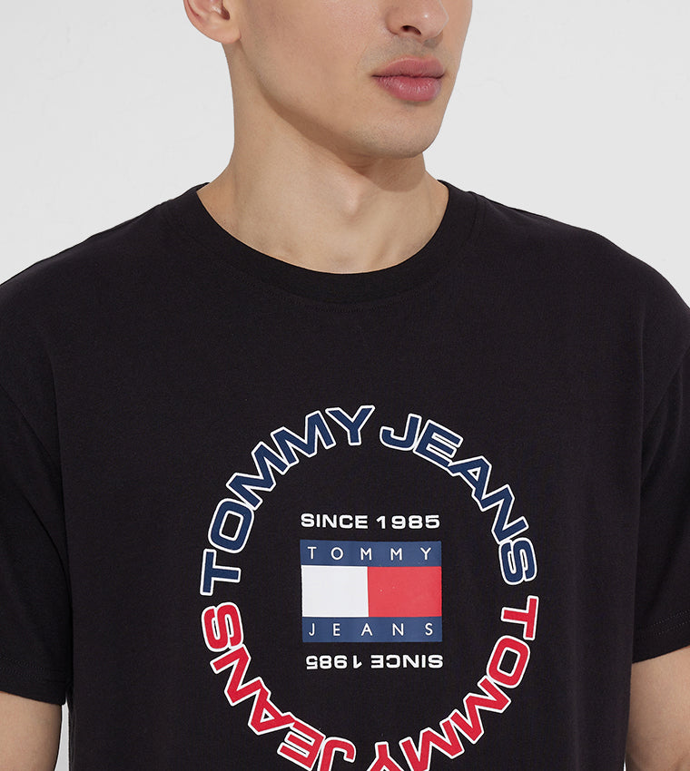 Toto čierne pánske tričko od značky Tommy Jeans predstavuje moderný prístup k klasickému dizajnu. S centrálnym kruhovým logom “Tommy Jeans Since 1985” v červeno-bielych farbách zaujme na prvý pohľad.